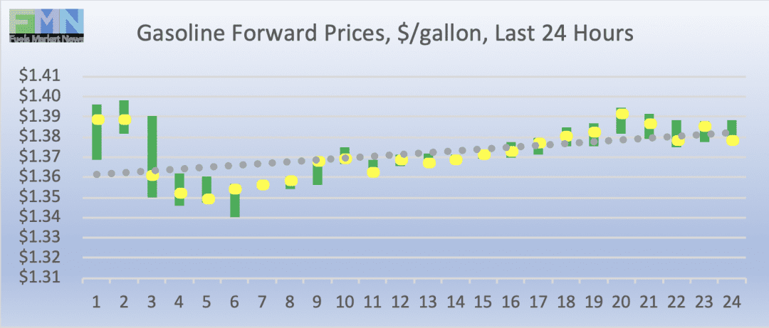 Gasoline opened on the NYMEX at $1.356/gallon today, up by 1.96 cents (1.40%) from Friday’s opening price of $1.3364 cents/gallon. Over the past 24 hours from 9AM EST to 9AM EST, gasoline prices rose by 1.06 cents (0.77%.) Prices have recovered significantly, and currently they are working to retain price levels of around $1.36-$1.38/gallon. The latest price is $1.3675/gallon.