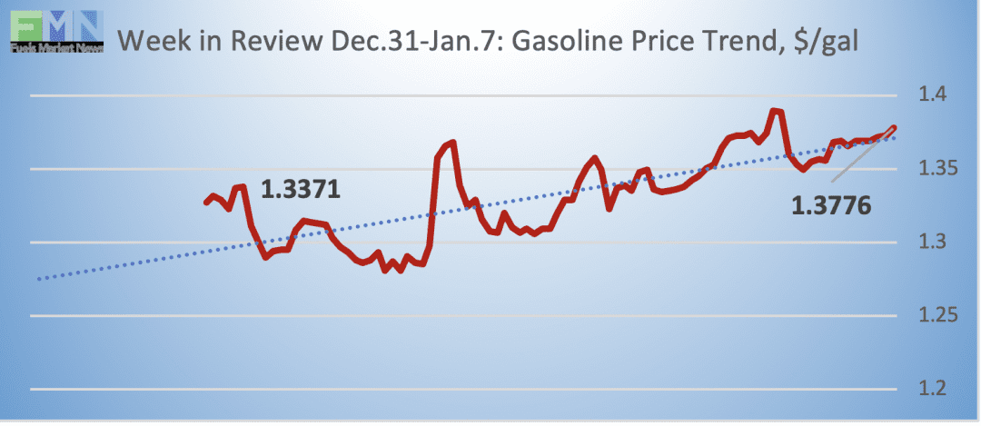 Crude oil prices finished last week strongly in the black, breaking a three-week losing streak. WTI crude prices opened last Monday, December31st, at $45.22/b and closed on Friday, January 4th, at $47.96/b, a significant gain of $2.74 (6.1%) for the week. Gasoline prices opened on Monday at $1.2929/gallon and closed on Friday at $1.3478/gallon, a gain of 5.49 cents/gallon (4.2%.) Diesel prices opened on Monday at $1.6539/gallon and closed Friday at $1.7692/gallon, a major gain of 11.53 cents/gallon (7.0%.)