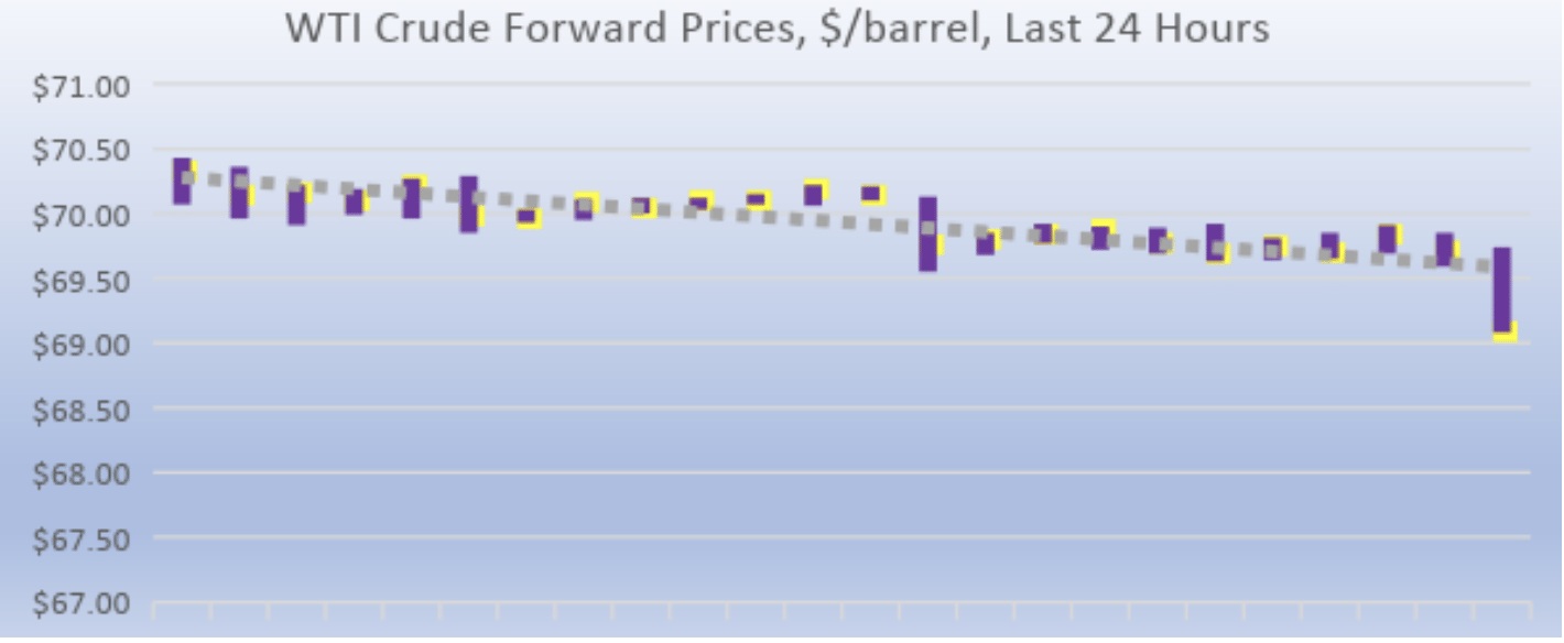 Over the past 24 hours, WTI crude prices have been sagging, receding swiftly from the $70/b levels they had hit the day before. Gasoline prices eased slightly, while diesel prices strengthened. Prices for all three are currently trending down.