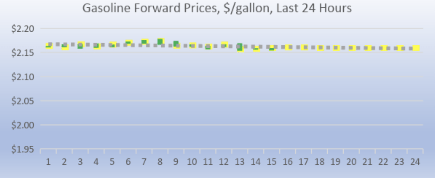 Gasoline opened on the NYMEX at $2.1604 today. Over the last 24-hour period from 9AM EST to 9AM EST, gasoline prices declined slightly by 0.12 cents/gallon. Prices are currently trending down. The latest price is $2.128/gallon.