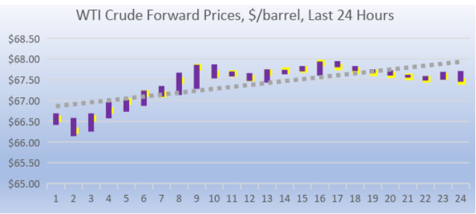 WTI (West Texas Intermediate) crude prices opened on the NYMEX at $67.78/b today. Over the last 24-hour period from 9AM EST to 9AM EST, crude prices recovered by $0.90/b (1.35%.) Prices currently are declining. The latest price is $67.24/b.