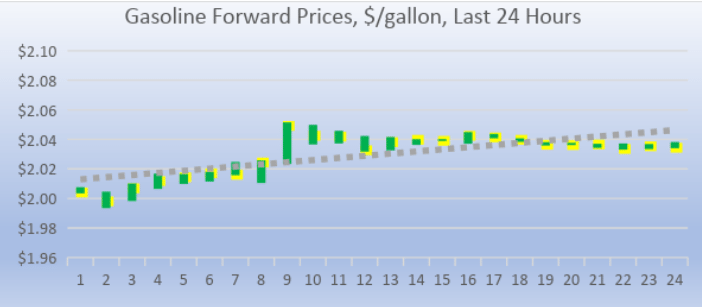 Gasoline opened on the NYMEX at $2.0411 today. Over the last 24-hour period from 9AM EST to 9AM EST, gasoline prices rose by 2.89 cents/gallon (1.44%.) Prices currently are stable with a slight downward bias. The latest price is $2.0291/gallon.