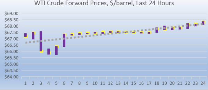 Over the past 24 hours, WTI (West Texas Intermediate) crude prices stabilized after their collapse yesterday morning, though prices in today’s trading session still opened below $68/b. Diesel and gasoline prices followed crude down into a trough, and they also began to pull out of the slump. Our three 24-hour price charts today show the sharp drop in prices, followed by the rebound.