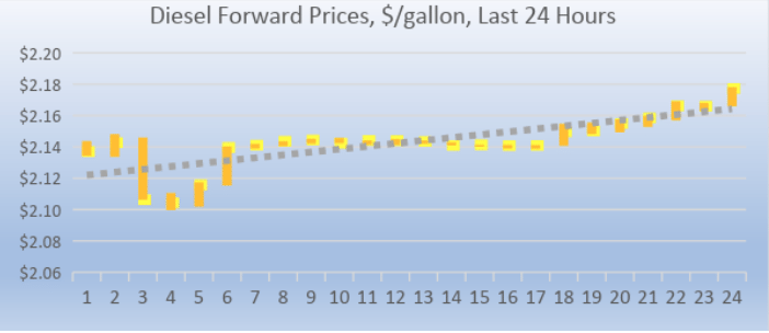Diesel opened on the NYMEX at $2.1437/gallon today. Over the last 24-hour period from 9AM EST to 9AM EST, diesel prices rose by 2.51 cents/gallon (1.17%.) Prices currently are trending up. The latest price is $2.1766/gallon.