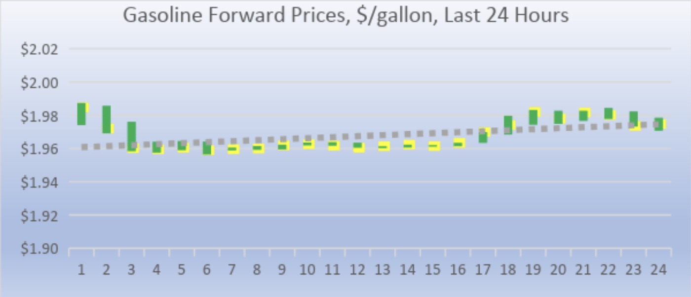Gasoline opened on the NYMEX at $1.9595 today, down by 1.54 cents from yesterday’s opening. Over the last 24-hour trading period from 9AM EST to 9AM EST, gasoline prices decreased by 0.4 cents/gallon (0.2%.) There was an early morning bump-up in buying, which has now levelled off. Currently, gasoline prices are stable. The latest price is $1.9741/gallon.