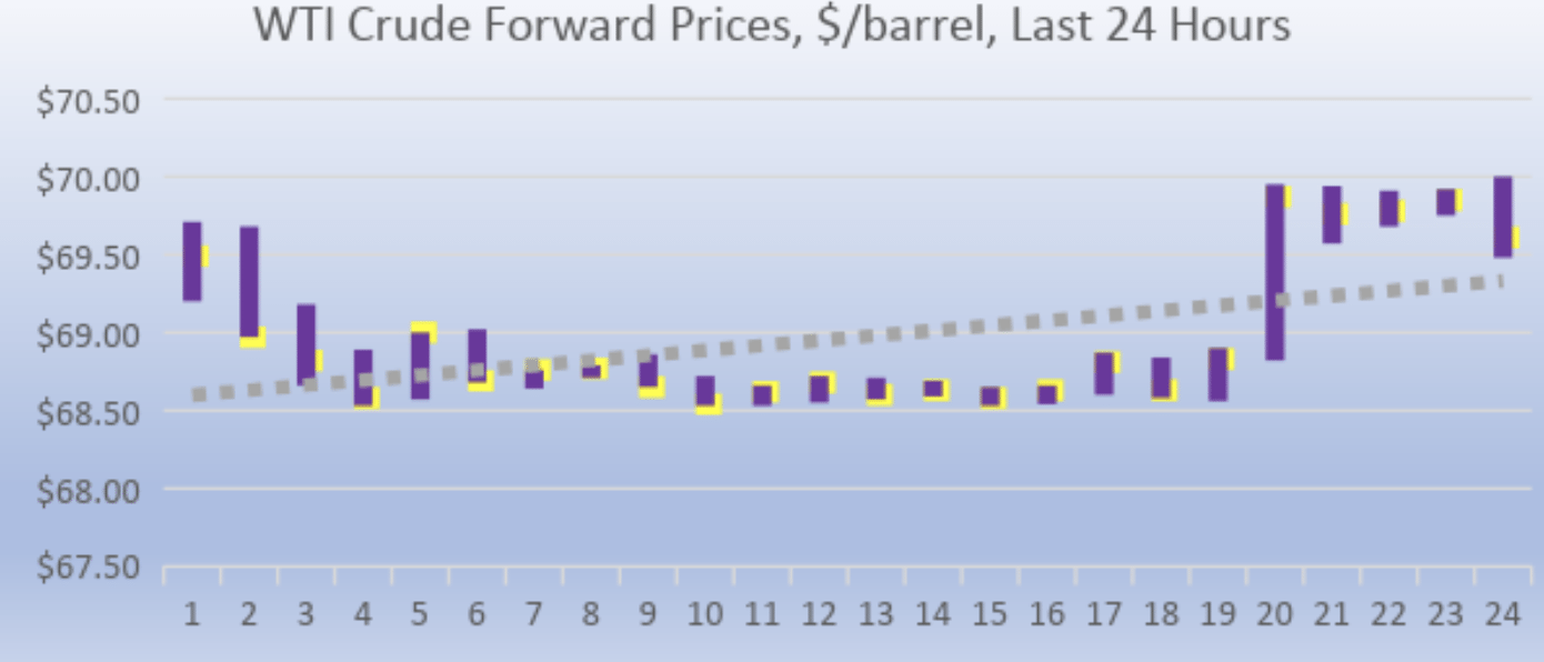 WTI (West Texas Intermediate) crude prices opened on the NYMEX at $68.80/b today, down slightly by $0.13 from yesterday’s opening price. Over the last 24-hour period from 9AM EST to 9AM EST, crude prices rose by $0.15/b (0.22%.) This morning brought a price rally, and crude prices currently are back up at the $70/b mark. The latest price is $70.13/b.