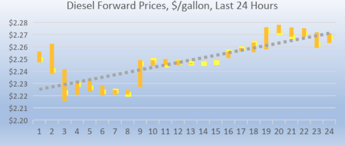 Diesel opened on the NYMEX at $2.2275/gallon today, down by 0.26 cents from Friday’s opening. Over the last 24-hour period from 9AM EST to 9AM EST, diesel prices began to rise again, adding 1.58 cents/gallon (0.7%.) Currently, prices are maintaining their gains. The latest price is $2.2673/gallon.