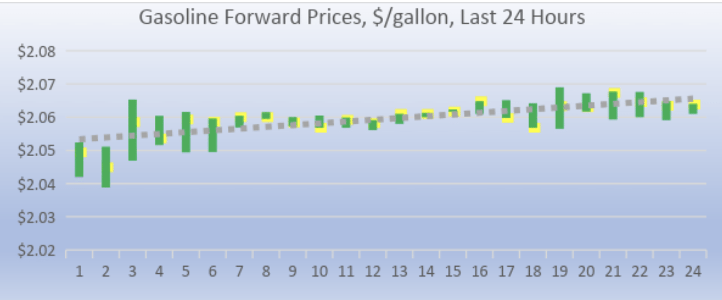 Gasoline opened on the NYMEX at $2.06 today, up strongly by 3.9 cents from yesterday’s opening. Over the last 24-hour trading period from 9AM EST to 9AM EST, gasoline prices gained 1.86 cents/gallon (0.91%.) Currently, prices are stable with an upward tilt. Gasoline prices are maintaining a strong position above $2.06/gallon. The latest price is $2.0685/gallon.