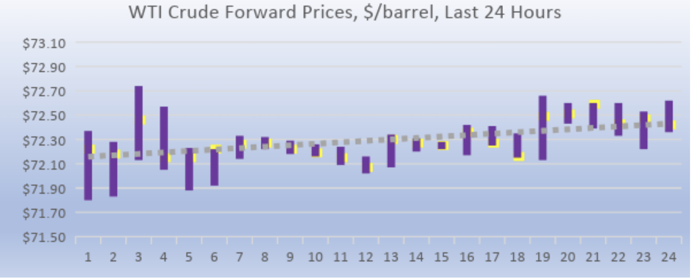 WTI (West Texas Intermediate) crude prices opened on the NYMEX at $72.25/b today, up by $1.11 from yesterday’s opening price. Over the last 24-hour period from 9AM EST to 9AM EST, crude prices rose by $0.66 (0.92%.) Currently, crude prices are continuing to rise, holding above $72.50/b. The latest price is $72.62/b.