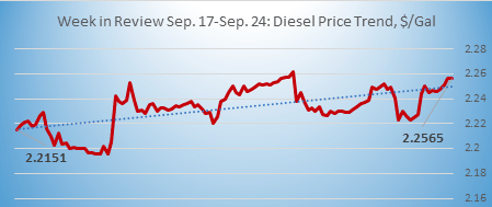 Diesel opened on the NYMEX at $2.3101/gallon today, an increase of 0.89 cents from yesterday’s opening. Over the last 24-hour period from 9AM EST to 9AM EST, diesel prices rose by 2.46 cents/gallon (1.07%.) Currently, prices are trending down, fighting to stay above the $2.30/gallon level. The latest price is $2.312/gallon.