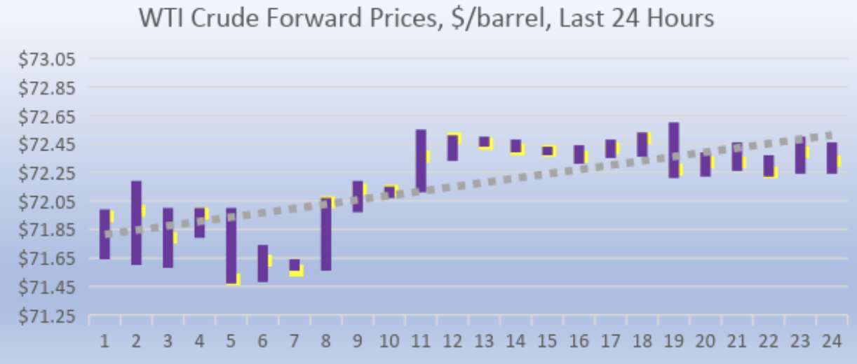 WTI (West Texas Intermediate) crude prices opened on the NYMEX at $72.01/b today, down slightly by $0.08 from yesterday’s opening price. Over the last 24-hour period from 9AM EST to 9AM EST, crude prices rose by $0.59 (0.82%.) Crude prices are now fighting to remain in the territory above $72/b, and currently are in the range of $72.00/b-$72.25/b. The latest price is $72.18/b.