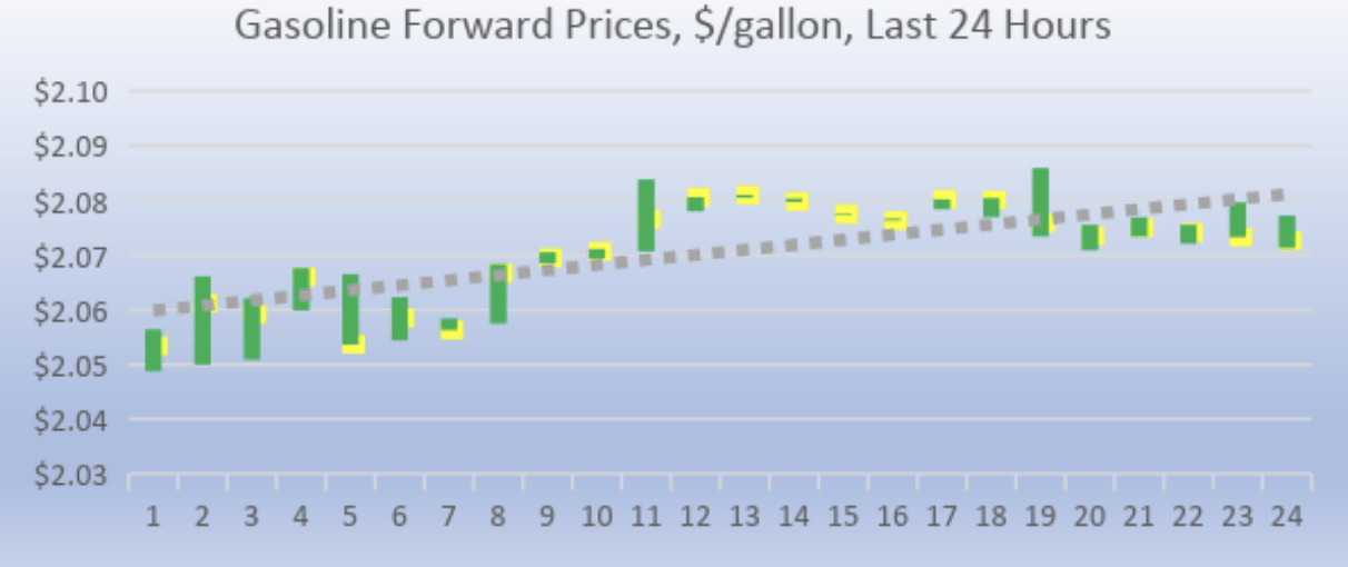 Gasoline opened on the NYMEX at $2.0695 today, up by 1.0 cent from yesterday’s opening. Over the last 24-hour trading period from 9AM EST to 9AM EST, gasoline prices rose by 2.48 cents/gallon (1.07%.) Currently, prices are falling. The latest price is $2.0657/gallon.
