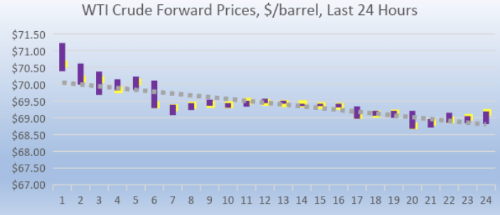 WTI (West Texas Intermediate) crude prices opened on the NYMEX at $69.43/b today, down by $0.46 from yesterday’s opening price. Over the last 24-hour period from 9AM EST to 9AM EST, crude prices dropped significantly by $2.21/b (3.1%.) Currently, crude prices are stabilizing. The latest price is $69.49/b.