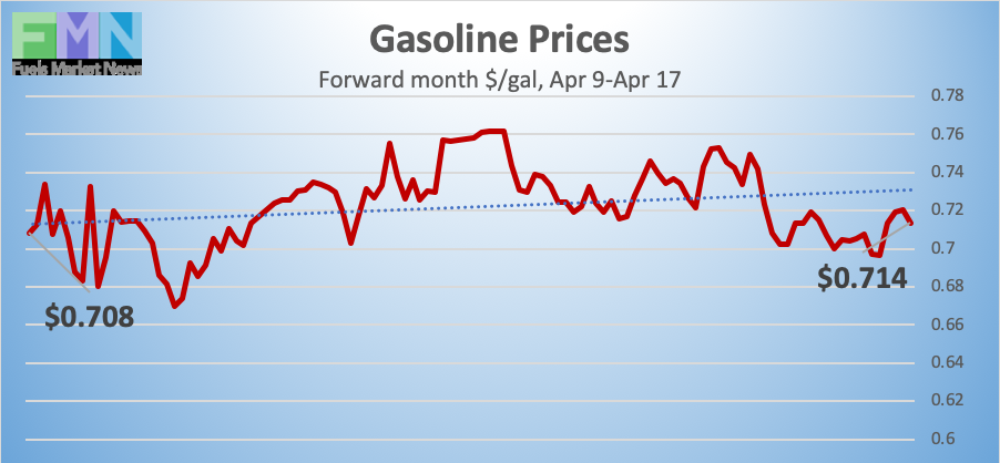 Gasoline opened on the NYMEX at $0.705/gallon on Thursday, April 9, and prices crept up slightly to open at $0.7135/gallon on Friday, April 17. This was an increase of 0.85 cents (1.2%). Prices have been limping back after the month of March brought a crippling collapse of nearly 87 cents per gallon. U.S. average retail prices for gasoline dropped by 7.1 cents/gallon during the week ended April 13th. Gasoline futures prices are strengthening today in anticipation that various states soon will begin to relax shelter-in-place rules, and a finish in the black is possible for the week. Crude oil prices are weak today, however, so it may be difficult for gasoline futures to hold. Gasoline futures prices are trading in the range of $0.68/gallon to $0.73/gallon. The latest price is $0.7311/gallon.
