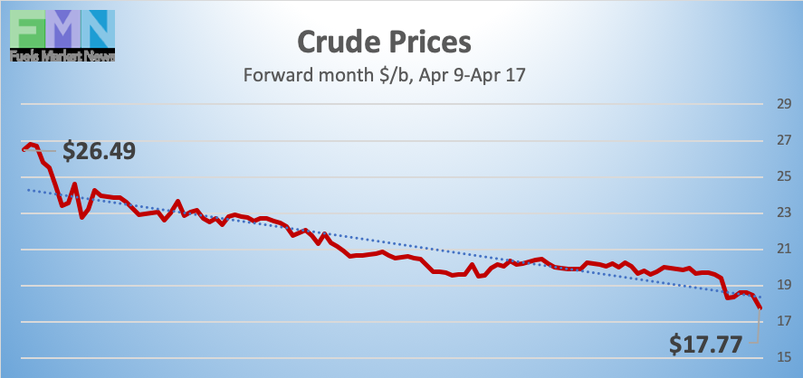 WTI (West Texas Intermediate) crude forward prices opened on the NYMEX on Thursday, April 9, at $26.28/b. Buying interest had risen before the Good Friday holiday in anticipation of the OPEC++ meeting. The meeting results fell short of what had been hoped for, but even a high-end agreement would have fallen short of coping with the extensive demand destruction. Prices fell every day since to open at $20.00/b on Friday, April 17. The Thursday-to-Friday closure week brought a loss of $6.28/b (23.9%). WTI futures prices dipped to a low of $19.20/b on Wednesday upon news of a huge inventory build. Today, even this low point has been broken, with WTI prices dipping to $17.31/b. WTI prices are hovering around $18/b currently. The latest price is $18.02/b.