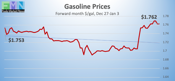 Gasoline opened on the NYMEX at $1.7536/gallon on Friday, December 27, and prices opened at $1.7069/gallon on Friday, January 3. This was a drop of 4.67 cents (2.7%.) U.S. average retail prices rose by 3.9 cents/gallon during the week ended December 30th. Until the U.S. airstrikes in Iraq, gasoline prices were headed for a finish in the red, after three consecutive weeks of gains. The attacks caused a price spike of over 5 cents per gallon since yesterday. Trades are occurring mainly in the range of $1.75-$1.78/gallon. The latest price is $1.7562/gallon.