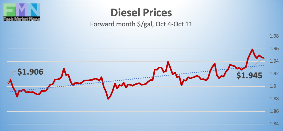 Diesel opened on the NYMEX at $1.8761/gallon on Friday, October 4, and opened on Friday, October 11, at $1.9344/gallon, a rebound of 5.83 cents (3.1%) after last week’s drop of 8.02 cents. Diesel forward prices had fallen by 13.68 cents over the past two weeks, normalizing after the price runup caused by the attacks on Saudi oil facilities. Prices this morning spiked alongside crude prices, after news of the attack on an Iranian-owned oil tanker near Jeddah. Yet crude prices trended back down. Diesel prices gave back only a portion of the gain, however, and the week appears to be heading for a finish in the black. Contracts currently are trading in the $1.93-$1.97/gallon range. The latest price is $1.9571/gallon.