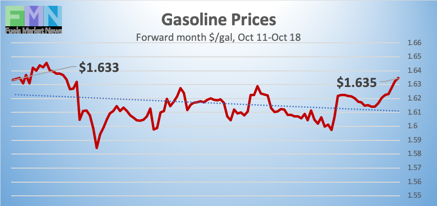 Gasoline opened on the NYMEX at $1.6202/gallon on Friday, October 11, and prices opened at $1.622/gallon on Friday, October 18. This was a slight increase of 0.18 cents (0.1%,) holding steady after last week’s recovery of 7.25 cents. U.S. average retail prices fell by 1.6 cents/gallon during the week ended October 14th. Futures prices for gasoline rose this morning, but the upward momentum is now faltering. If the week finishes in the black, the gains may be small. Trades are occurring mainly in the range of $1.61-$1.64/gallon. The latest price is $1.6276/gallon.