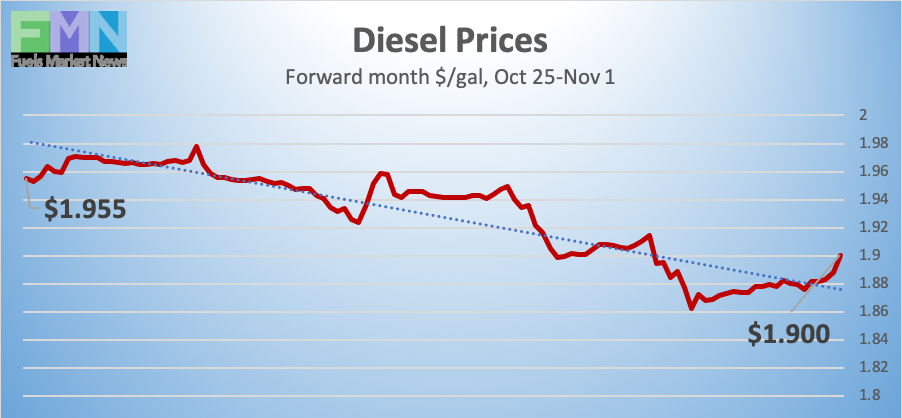 Diesel opened on the NYMEX at $1.9838/gallon on Friday, October 25 and opened on Friday, November 1 at $1.8749/gallon, down significantly by 10.89 cents (5.5%.) Note that futures contracts switched to December forward month, so there is a discontinuity in the price series. Prior to this week, diesel prices had risen for three consecutive weeks. Diesel futures prices are trending back up in early morning trades, but the upward momentum is now slowing. The week appears to be heading for a finish in the red. Contracts currently are trading in the $1.87-$1.91/gallon range. The latest price is $1.8987/gallon.