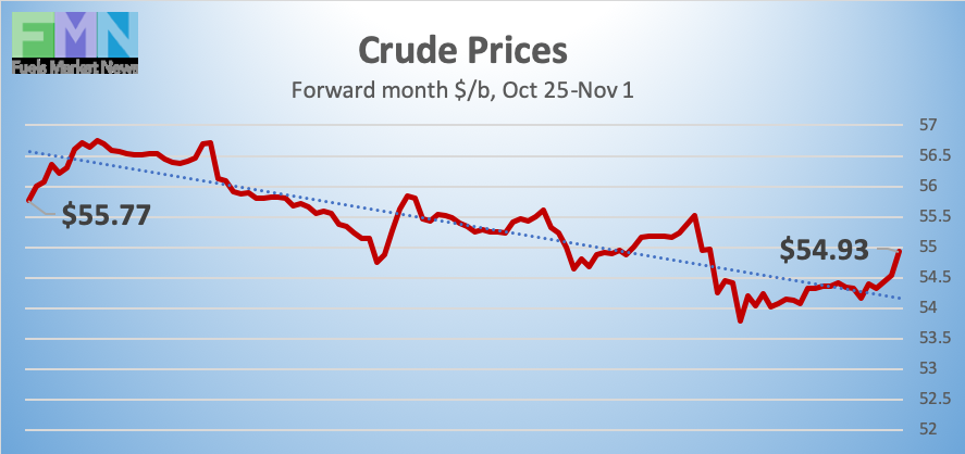 WTI (West Texas Intermediate) crude forward prices opened on the NYMEX on Friday, October 25 at $56.07/barrel and declined to an open of $54.15/barrel on Friday, November 1, a decline of $1.92/b (3.4%.) This handed back the $1.98/b gain accomplished last week, when WTI futures hit highs over $56.50/b. Futures contracts switched to December forward month. Crude prices are rising this morning in early trades, though the week still appears to be heading for a finish in the red. WTI crude is trading mainly in the range of $54.00/b-$55.00/b. The latest price is $54.86/b.