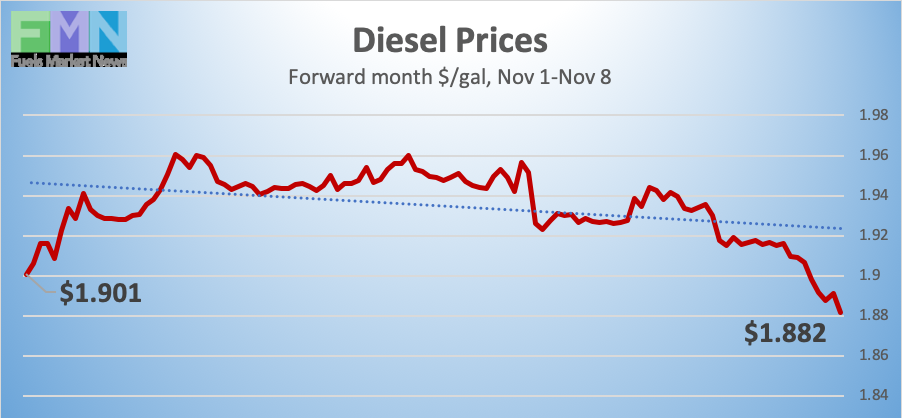 Diesel opened on the NYMEX at $1.8749/gallon on Friday, November 1, and opened on Friday, November 8, at $1.9191/gallon, up by 4.42 cents (2.4%.) This recouped a portion of last week’s loss of 10.89 cents. Diesel futures prices are falling in early morning trades, as midweek optimism over U.S.-China tariffs fades. The week may finish with prices back where they began, handing back all the gains achieved during the week’s rally. Contracts currently are trading in the $1.87-$1.91/gallon range. The latest price is $1.8751/gallon.