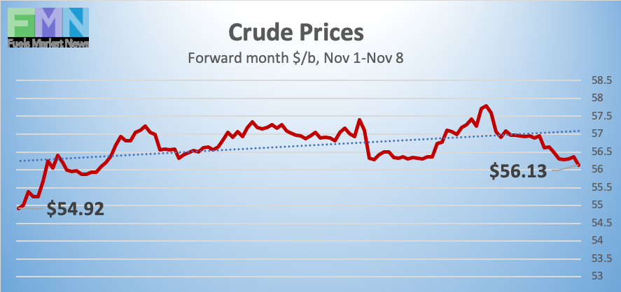 November 8, 2019: Crude prices are falling today after a midweek surge. Prices rose upon the news that China and the U.S. would begin to roll back tariffs. Developments in the trade war routinely stimulate then quench buying enthusiasm, but this news was more concrete than most. Lack of unanimity in the White House is sending prices back down today. Oil prices received longer-term support this week when Saudi Aramco launched its long-awaited IPO. High oil prices will translate into high valuation, so Saudi Arabia has strong incentive to keep prices high. WTI futures crude prices opened on Friday, November 1, at $54.15/b, and prices rose to an open of $57.08/b today, a significant gain of $2.93/b. Currently, prices are declining, and WTI futures have retreated below $56.00/b. This week may finish with crude prices in the black nonetheless, since the starting basis last Friday was just above $54/b. Gasoline and diesel prices have retreated, and they may not be able to hang on to any of the midweek gains. Our weekly price review covers hourly forward prices from Friday, November 1, through Friday, November 8. Three summary charts are followed by the Price Movers This Week briefing for a more thorough review.