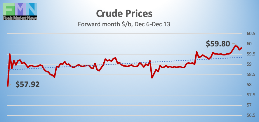 WTI futures crude prices opened on Friday, December 6, at $58.32/b, and prices rose to an open of $59.36/b today, up by $1.04/b. WTI futures prices regained and surpassed the $59/b level, and briefly hit a high of $60/b. WTI futures prices have not cracked the $60/b barrier since mid-July. This week should finish with oil prices in the black. Gasoline and diesel prices followed crude up today. Our weekly price review covers hourly forward prices from Friday December 6 through Friday December 13. Three summary charts are followed by the Price Movers This Week briefing for a more thorough review.
