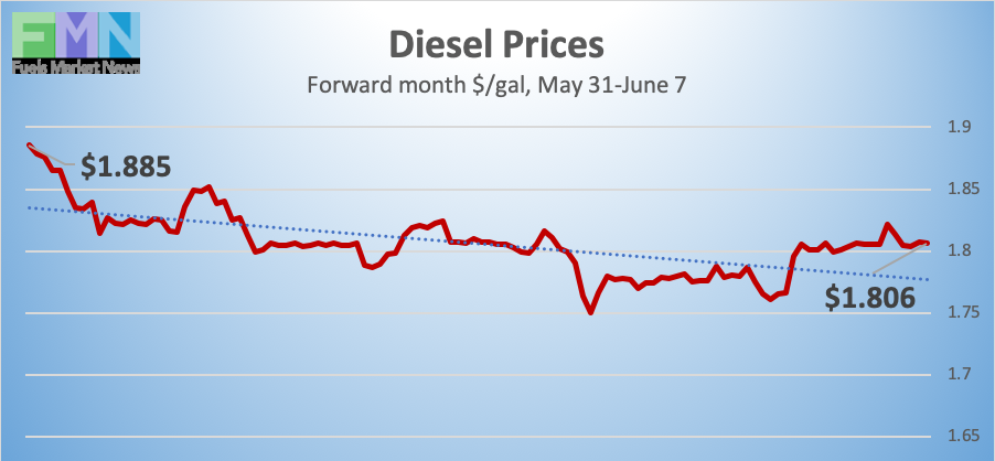 Diesel opened on the NYMEX at $1.9164/gallon on Friday May 31st and opened on Friday June 7th at $1.8011/gallon, a decline of 3.8 cents (2.1%.) Prices stabilized yesterday, but a weak Jobs Report is moving markets down again this morning. Diesel forward prices have plummeted by 24.89 cents/gallon over the last three weeks. Diesel contracts currently are trading in the $1.79-$1.82/gallon range. The latest price is $1.801/gallon.