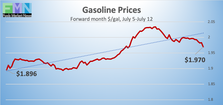 Gasoline opened on the NYMEX at $1.921/gallon on Friday July 5th, and prices climbed to an open of $1.9895/gallon on Friday July 12th, a significant increase of 6.85 cents (3.6%.) Gasoline forward prices been on a downward trend, bottoming out at their lowest levels since February. The closure of the PES refinery in Philadelphia started a gasoline price rally that stacked atop the already strengthening crude prices. PES announced that it would not rebuild the refinery, and the government demurred to spend more public money saving it. Gasoline prices are flattening this morning, with trades occurring mainly in the range of $1.97-$1.99/gallon. The latest price is $1.9803/gallon.