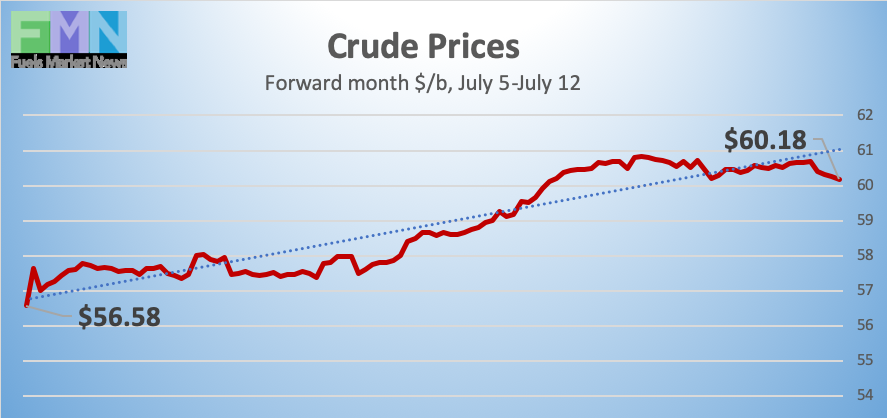 Oil prices rebounded this week, recapturing the $60/b level for the first time in seven weeks. Although U.S. crude production hit a new record, oil inventories fell sharply. Geopolitical tensions continue in the Gulf, as Iranian military boats attempted to seize a British tanker. WTI crude prices opened this morning $3.08/b (5.4%) above last Friday’s level. Prices this morning are roughly flat. Our weekly price review covers hourly forward prices from 9AM EST Friday July 5th through 9AM EST Friday July 12th. Three summary charts are followed by the Price Movers This Week briefing for a more thorough review.
