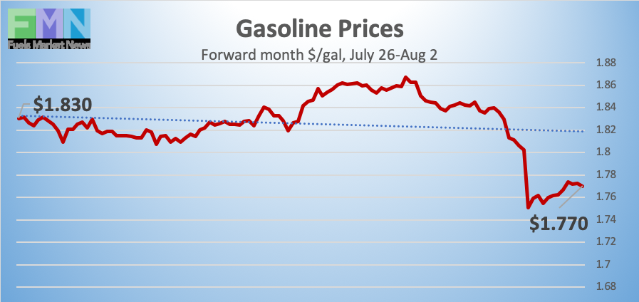Gasoline opened on the NYMEX at $1.8803/gallon on Friday July 26th, and they opened at $1.755/gallon on Friday, August 2nd. This was a sharp drop of 12.53 cents (6.7%) following last week’s moderate recovery of 3.17 cents (1.7%.) This week brought a drawdown in inventories, which bumped prices up midweek. By the end of the week, however, concerns of economic weakness and oil oversupply resurfaced. Gasoline prices are recovering this morning, with trades occurring mainly in the range of $1.76-$1.80/gallon. The latest price is $1.795/gallon.