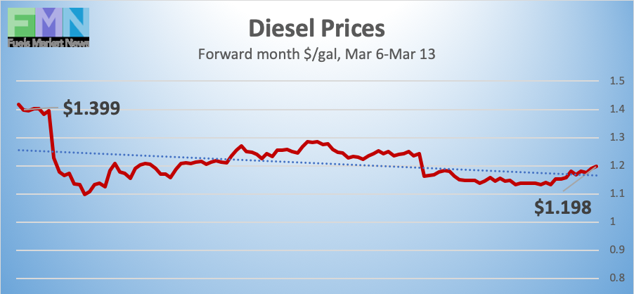 Diesel opened on the NYMEX at $1.4917/gallon on Friday, March 6, and opened on Friday, March 13, at $1.138/gallon, a major drop of 35.37 cents (23.7%). U.S. average retail prices for diesel fell by 3.7 cents/gallon during the week ended March 9th. Retail prices for diesel have fallen for nine consecutive weeks. Diesel futures prices ranged this week from a low of $1.0799/gallon on Monday to a high of $1.3023/gallon on Wednesday, a large range of 22.24 cents. Prices are falling again currently after an overnight rally. The week is heading for a finish deep in the red. Contracts have been trading mainly in the $1.13-$1.19/gallon range. The latest price is $1.1647/gallon.