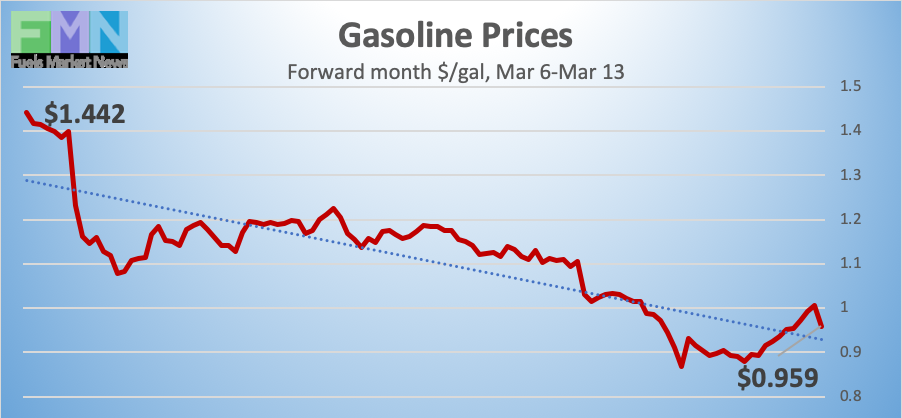 Gasoline opened on the NYMEX at $1.5189/gallon on Friday, March 6, and prices crashed to open at $0.8975/gallon on Friday, March 13. This was a drop of 62.14 cents (40.9%). Gasoline futures prices ranged this week from a high of $1.2348/gallon on Tuesday to a low of $0.8853/gallon on Friday, a massive range of 34.95 cents. U.S. average retail prices for gasoline fell by 4.8 cents/gallon during the week ended March 9th. Futures prices for gasoline currently are volatile, with a brief upturn overnight now reversing. The week will finish deep in the red. Trades are occurring mainly in the range of $0.88-$0.98/gallon. The latest price is $0.9139/gallon.