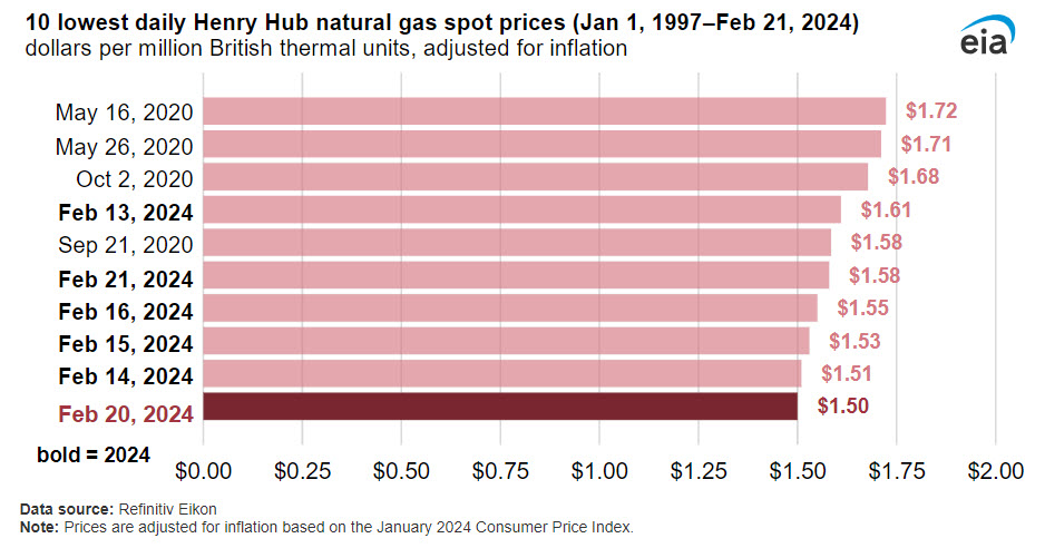 The U.S. benchmark Henry Hub daily natural gas price averaged $1.50 per million British thermal units (MMBtu) on February 20, 2024, the lowest price in inflation-adjusted dollars since at least 1997, according to data from Refinitiv Eikon. High natural gas production, low natural gas consumption, and higher natural gas inventories than the previous five-year (2018–22) average contributed to prices declining for much of 2023 and the first two months of 2024.