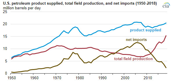 The United States imported about 8 million b/d of crude oil in 2018, a 3% decrease from 2017. Net imports of crude oil and petroleum products were down to about 2 million b/d, the lowest level since 1967. The United States still imports crude oil because of geographic and quality considerations.