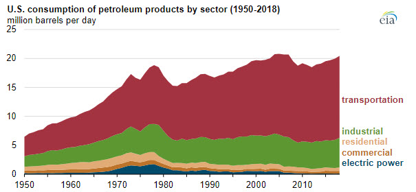Most crude oil is refined into petroleum products used for transportation, such as motor gasoline, diesel, and jet fuel. The transportation sector has been the largest consumer of petroleum products in the United States since at least 1949, the earliest year for which EIA has data. Transportation accounted for about 14 million b/d of petroleum consumption in 2018. This level was the second highest since its peak in 2007.
