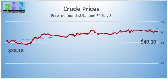 Oil prices eased Friday, but they maintained some of the week’s gains coming from a significant drawdown from crude oil inventories and bolstered by a strong Jobs Report. These have, at least temporarily, comforted markets troubled by the distressing increase in COVID-19 infections and fatalities. Ahead of the Independence Day weekend, 36 states were reporting increases in infections, and some state governors were restoring social distancing measures, or at least pausing on economic re-opening plans. West Texas Intermediate (WTI) crude prices were clinging to the $40 a barrel level. Crude and refined product prices are showing a gentle downward trend, but the week appeared likely to be headed for a finish in the black. Trading over the holiday weekend was expected to be limited.