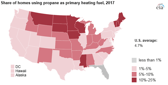 The Midwest accounts for about 21% of propane consumption in the United States and typically holds about 30% of U.S. propane inventories. The Midwest has the highest percentage of homes heated by propane in the United States. In addition to being used for space heating, propane is used as a feedstock for petrochemical plants and for drying agricultural crops before storage.
