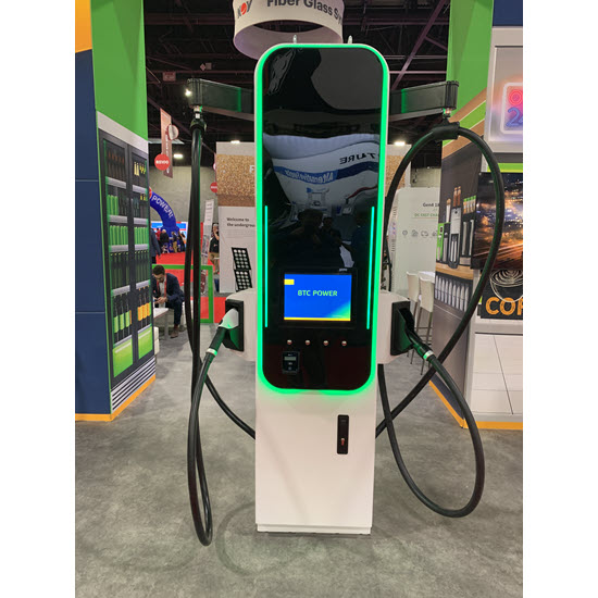BTC POWER is a leading manufacturer of electric vehicle charging systems in North America. BTC POWER’s product portfolio consists of both DC and AC charging systems with power ranges from 6.6kW to 350kW. The company highlighted its Gen 4 360kW split system which features up to 500A continuous power. It’s future proofed with a maximum of 1000VDC architecture. It is available up to 360kW power level configuration, and can charge up to two vehicles with the single dispenser using the same tower.