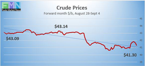 Oil markets are falling today, following the stock market. Yesterday, the stock market posted its heftiest loss since June, with ebullient tech stocks finally handing back some gains. The Dow Jones Industrial Average dropped 2.78%, the S&P 500 fell 3.51%, and the Nasdaq fell 4.96%. Crude oil futures dropped sharply, threatening to fall below $40 a barrel. Today, there are indications that stocks will have a mixed day, and that the overall rout will stabilize. Some of the tech stocks had posted such astounding gains that a downward correction may have been expected, especially with pre-Labor Day profit-taking. The just-released August jobs report was very encouraging. Oil prices are stabilizing, and WTI crude oil futures appear to be maintaining their hold in the vicinity of $41 a barrel. Crude and product prices appear to be heading for a finish in the red this week.