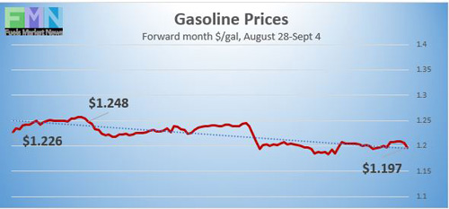 Gasoline futures prices opened at $1.2049 a gallon today on the NYMEX, compared with $1.21 a gallon on Friday, August 28. This was a decline of 0.51 cents (0.4%). March brought a crippling collapse of nearly 87 cents per gallon, but prices gradually crept back up in April and May. U.S. average retail prices for gasoline rose 4.0 cents to average $2.222/gallon during the week ended August 31. Retail prices reclaimed the territory above $2 per gallon during the first week of June. Last week, gasoline futures prices spiked midweek in response to the impending hurricane and a significant draw from inventories, hitting highs of $1.434 a gallon. But prices retreated thereafter. A holiday weekend such as Labor Day often strengthens gasoline prices, but today’s trading is not showing this. Gasoline futures are trading in the range of $1.18/gallon to $1.21/gallon. The week appears to be heading for a finish in the red. The latest price is $1.1835/gallon.