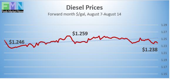 Diesel opened on the NYMEX today at $1.2425/gallon, down by 0.91 cents, or 0.7%, from last Friday’s open of $1.2516/gallon. U.S. average retail prices for diesel rose by 0.4 cents per gallon during the week ended August 10 to average $2.428/gallon. Diesel prices generally have weakened this year, missing some of the price recovery see in crude and gasoline markets. Diesel futures prices rose midweek when inventory draws were announced, but prices have moved little on a weekly basis. Today, prices are heading down, but the downward price trend is slowing. Prices may finish the week in the red. Currently, diesel is trading mainly in the range of $1.232-$1.254/gallon. The latest price is $1.2429/gallon.