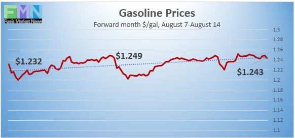 Gasoline futures prices opened at $1.2364 per gallon today on the NYMEX, compared with $1.2315/gallon on Friday, August 7. This was a gain of 0.49 cents (0.4%.) March brought a crippling collapse of nearly 87 cents per gallon, but prices gradually crept back up in April and May. U.S. average retail prices for gasoline fell by one cent/gallon during the week ended August 10. Nine weeks ago, retail prices reclaimed the territory above $2 per gallon. Retail prices averaged $2.166/gallon at the national level. Gasoline futures prices have been stable this week, trading small gains with small losses each day. Currently, gasoline futures are trading in the range of $1.235/gallon to $1.253/gallon. The week appears to be heading for a finish slightly in the black. The latest price is $1.2419/gallon.