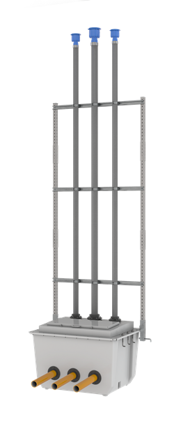The VSE Vent Transition Sump is the newest addition to OPW’s growing E-Series Sump family. The VSE is an at-grade sump constructed with a fiberglass base and a powder-coated steel top. The laser-cut top features a lockable access hatch with field-tested water-shedding ability. The powder-coated and light color finish reduce heat absorption for enhanced service life. The tops are fully customizable and shipped with pre-cut vent-stack entries. Rigid Entry Fittings (REF) are included with the pre-cut sump top, with UV-resistant caps provided. The base is OPW’s DSE Dispenser Sump model, which is manufactured using Sheet-Molded Compound (SMC) technology that creates sumps with consistent wall thicknesses and smooth walls inside and out. The Vent Stack Modular Rack System is constructed of rust/corrosion-resistant galvanized steel that can be configured in heights from 4 to 12 feet.