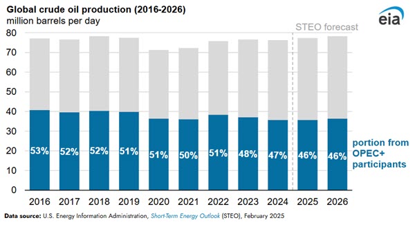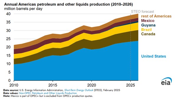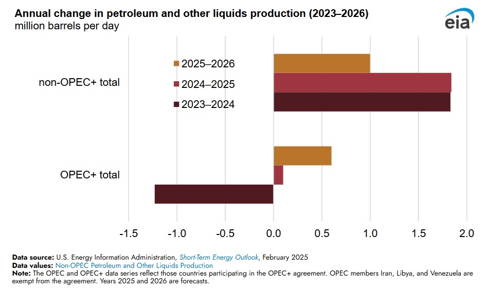 We forecast that worldwide production of petroleum and other liquids in 2025 and 2026 will grow more in non-OPEC+ countries than in OPEC+ countries in our February Short-Term Energy Outlook (STEO). We estimate that total world petroleum and other liquids supply increased by about 0.6 million barrels per day (b/d) in 2024 and will increase by 1.9 million b/d in 2025 and 1.6 million b/d in 2026. Increasing crude oil production from four countries in the Americas—the United States, Guyana, Canada, and Brazil—drives this growth. Because of ongoing production restraint among OPEC+ countries, we forecast the group’s production to grow by 0.1 million b/d in 2025 and 0.6 million b/d in 2026.