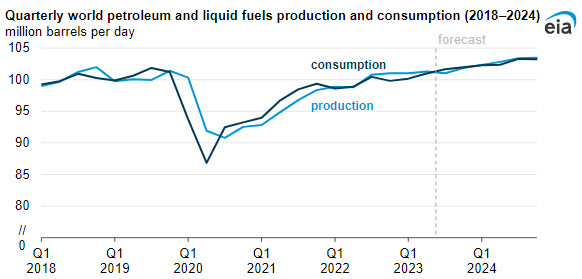 We forecast that global stock draws will average 520,000 b/d in August 2023 and 1.4 million b/d in September 2023. We forecast average global stock draws of 120,000 b/d in the fourth quarter of 2023 will help sustain oil prices in the upper-$80s during that period. In 2024, we forecast that the global supply of petroleum and liquid fuels will closely match demand and the price of Brent will average $86/b.
