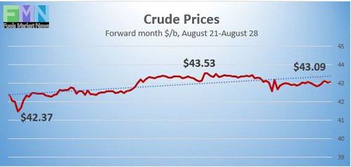 WTI crude futures prices opened at $42.98 a barrel today, up by $0.23 a barrel (0.5%) from last Friday’s open of $42.75 a barrel. The days leading to Hurricane Laura stimulated buying interest, and prices surged. Inventory reductions also supported prices midweek. Thursday brought an ebbing of prices. Today, prices are strong and stabilizing, and WTI futures prices are hovering around $43 a barrel. This should ensure another weekly finish in the black. Our weekly price review covers hourly forward prices from Friday, August 21 through Friday, August 28. Three summary charts are followed by the Price Movers This Week briefing, which provides a more thorough review.