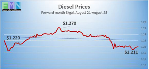 Gasoline futures prices opened at $1.2786 a gallon today on the NYMEX, compared with $1.2981 a gallon on Friday, August 21. This was a decline of 1.95 cents (1.5%). March brought a crippling collapse of nearly 87 cents per gallon, but prices gradually crept back up in April and May. U.S. average retail prices for gasoline rose 1.6 cents to average $2.182/gallon during the week ended August 24. Eleven weeks ago, retail prices reclaimed the territory above $2 per gallon. Gasoline futures prices spiked midweek in response to the impending hurricane and a significant draw from inventories, hitting highs of $1.434 a gallon. Prices retreated on Thursday and into early Friday trading but are coming back currently. Gasoline futures are trading in the range of $1.270/gallon to $1.305/gallon. If prices hold, the week may end slightly in the black. The latest price is $1.2936/gallon.