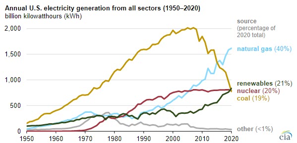 In 2020, renewable energy sources (including wind, hydroelectric, solar, biomass, and geothermal energy) generated a record 834 billion kilowatthours (kWh) of electricity, or about 21% of all the electricity generated in the United States. Only natural gas (1,617 billion kWh) produced more electricity than renewables in the United States in 2020. Renewables surpassed both nuclear (790 billion kWh) and coal (774 billion kWh) for the first time on record. This outcome in 2020 was due mostly to significantly less coal use in U.S. electricity generation and steadily increased use of wind and solar.