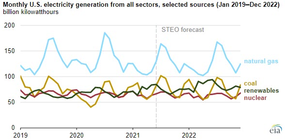 We expect coal-fired electricity generation to increase in the United States during 2021 as natural gas prices continue to rise and as coal becomes more economically competitive. Based on forecasts in our Short-Term Energy Outlook (STEO), we expect coal-fired electricity generation in all sectors in 2021 to increase 18% from 2020 levels before falling 2% in 2022. We expect U.S. renewable generation across all sectors to increase 7% in 2021 and 10% in 2022. As a result, we forecast coal will be the second-most prevalent electricity source in 2021, and renewables will be the second-most prevalent source in 2022. We expect nuclear electric power to decline 2% in 2021 and 3% in 2022 as operators retire several generators.